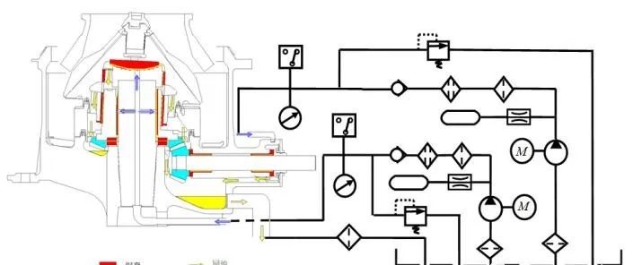 圆锥破碎机的润滑系统主要由润滑油流道、摩擦副、油箱、电动机、油泵、过滤器、安全阀、蓄能器、压力表、压力开关及通气装置等组成,如图所示。
